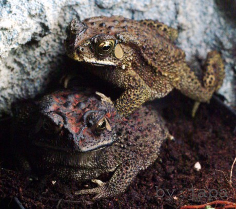 KRMENÍ: žáby krmím pomocí větší pinzety - zkrmuji především žížaly dešťovky a rousnice, holátka a malé myši, šváby. Dále pak filety ze pstruha, nebo kapra a drůbeží srdce. Velikost sousta záleží na velikosti žáby. U myší je potřeba dát pozor, aby krmné zvíře žábě neublížilo. Mladé žabky krmím obden. K jídlu je stimuluji šimráním potravou po čelistech. Starší žáby a dospělé krmím 1x týdně - 1x za 3 týdny, vždy záleží na druhu a velikosti potravy. Není výjimkou, že žáby nejedí i několik měsíců. Pokud si drží stále svojí váhu a nijak nestrádají není důvod k panice.